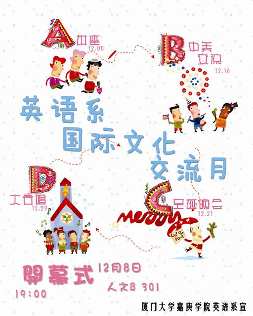 为了给我系的同学们提供一个近距离接触国际文化的机会,为了让大家更好地了解国际文化,提高大家学习英语的热忱,我系特别在十二月举办“国际文化交流月”系列活动。具体活动安排如下: