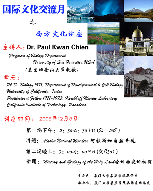 厦门大学嘉庚学院英语系将于12月举办“国际文化交流月”系列活动。届时将邀请美国旧金山大学Dr. Paul Kwan Chien为同学们举办两场专题讲座。兹定于12月8日14:30—16:30在公一208教室举办首场讲座,主题为Alaska Natural Wonders (阿拉斯加自然奇观);本次系列活动的开幕式暨第二场讲座—History and Geology of the Holy Land (圣地的史地初探) 将于19:00—21:00在文B301教室举行。欢迎同学们踊跃参加。