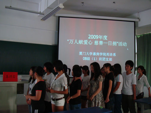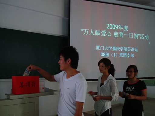 为响应院工会与院团委的号召,为满足同学们奉献爱心的愿望,2009年6月8日下午4时许,08级(1)班于人文楼举行主题为“万人献爱心、慈善一日捐”的募捐活动。