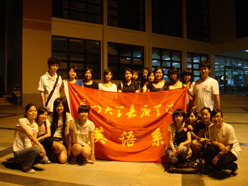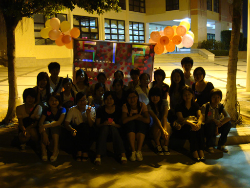为表达自己对于灾区人民的祝福,08级(1)班全体同学于晚上9点在中区食堂门口集体参加荧光祈福活动,同学们在心形小纸条上写下自己祝福的话语,为灾区人民加油打气,然后将手中的荧光棒粘在海报上,拼成512的字样。