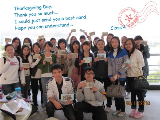 下课之后,每个人领到了一张明信片,每个星期原本都很活跃的课间,此刻安静。经过团支书关于明信片格式的讲解,大家纷纷拿出手中的笔,开始在明信片的左上方写上邮政编码,在右下方写下一个个要感谢的人的名字,在左边写下一句句想说的感谢的话,在右边写下一个个即将收到此份感谢的地址。