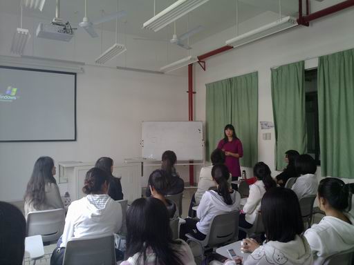 首先,由参加了今年第十四届中国国际贸易洽谈会(厦门98洽贸会)的洪素华与同学们分享了此次洽贸会上的经历,分享了她短短三天在洽贸会上作为志愿者的点点滴滴,虽然仅仅是为展馆内的一名工作者,但是却通过与不同展馆、不同国籍的工作者乃至参展商结下了不解之缘,在洽贸会上广交朋友,在实践的过程中,收获友谊,收获锻炼机会,提高了自身的口语,也发现了存在的不足,如适应各种不同口音的能力,口语表达能力尚待提高等等。