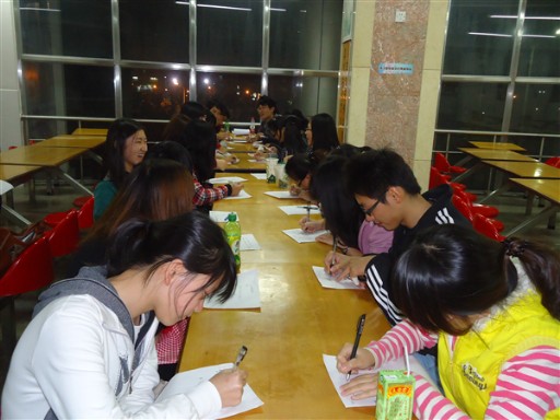 活动总共由三个环节构成,而主线就是每位同学手中的一张纸.一张小小的白纸上凝聚了三个方面的内容--''你问我答","相应惩罚',以及一段感恩的话! 瞧,同学们正在绞尽脑汁地想着稀里古怪的问题,想着那些让自己都不得不发笑的惩罚,以及那埋藏内心已久的对家人,朋友的感恩! 活动如火如荼地进行着,果然,大家的脑袋是如此的不同凡响,不管是问题还是惩罚带来的surprise都是一浪高过一浪,高潮不断.伴随着每个人的笑声,活动进行到了最后一个环节.每位同学都大声地读出了自己所要感恩的人与事,不管是带给我们快乐的,还是悲伤的,我们都应该怀着一颗感恩的心,因为无论怎样,我们从中坚强地成长了!