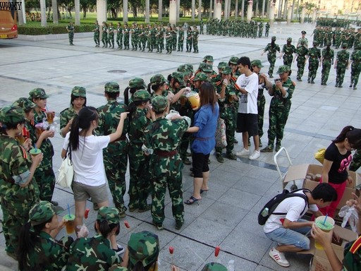 时值傍晚,踏着落日,英语系学生会几位干部成员在主席的带领下,走进了生气蓬勃的“绿服小军人”之中。当学长学姐们为学弟学妹们递上了冰爽解渴的绿茶和美味的小点心,并真切地关怀他们,鼓励他们坚持训练时,学弟学妹们疲累的脸上露出了可爱的笑容。他们表达出了对学长学姐们慰问的感谢,表现出了对军训坚持到底的勇气。