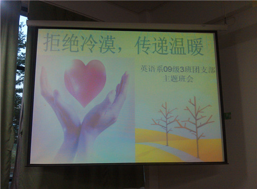 10月31日,英语系09(3)班团支部就“小悦悦事件”于公一119召开主题为“拒绝冷漠,传递温暖”班会,引导同学们拒绝冷漠,奉献爱心,传递温暖。