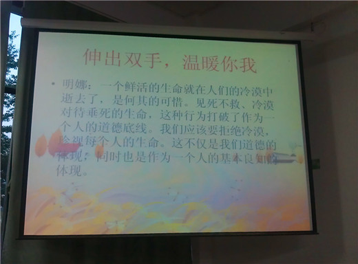 在班会准备之前,每个同学都发表了自己对于这件事的看法,并由团支书张莉莉同学整理为PPT。会上,很多同学对此事都予以关注,并就冷漠的路人、拾荒救人的老人、自身的态度、国家社会道德风气、法制建设发表了自己的观点,并表示拒绝冷漠应从自我做起,从身边做起。激烈的发言是每个与会者的心灵受到震撼和洗礼。