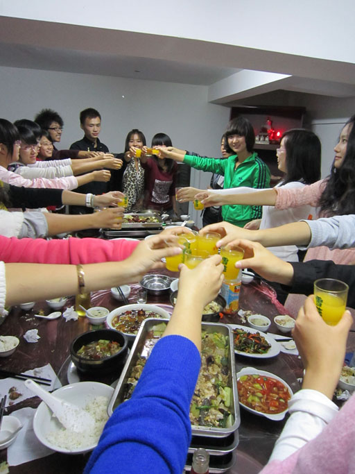 大家先是去了南区外面的“春色满园”饭店,同学们围坐成一个大圆圈吃起了热气腾腾的火锅。开始的时候同学们因为害羞都有些拘谨,后来在班委们的带动下,同学们都开始踊跃的做上了游戏。真心话大冒险将游戏推向了小高潮。