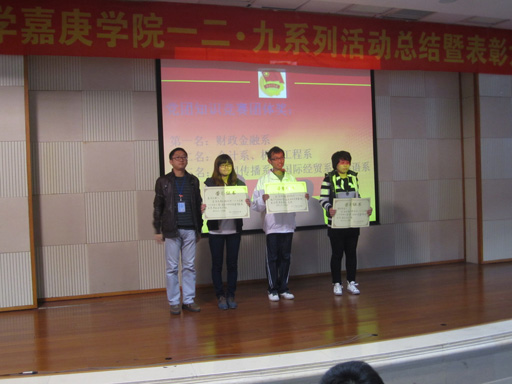 其次,大会先后颁发了环校跑比赛团体奖、党团知识竞赛团体奖、油纸伞面设计大赛奖项、一二.九“积极分子”和一二.九“优秀组织奖”等五个奖项,共由六个系和119人获得。我系荣获了党团竞赛三等奖。