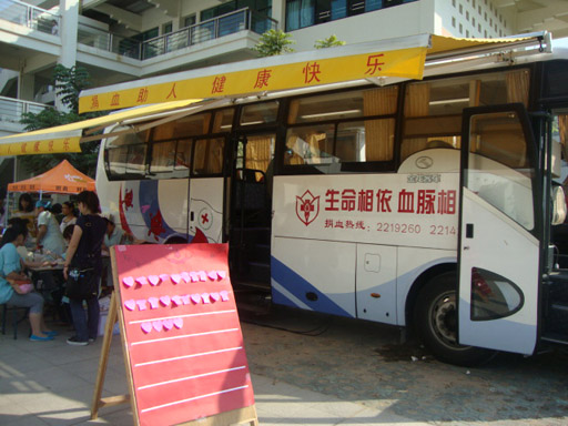 年11月4日中午,骄阳似火,厦门大学嘉庚学院的南区食堂人头拥簇。由厦门大学嘉庚学院英语系学生党支部及厦门大学嘉庚学院英语系团总支联合举办的无偿献血活动如火如荼的开展。两辆采血车静静地停在一起,志愿者和各个工作人员从早上8:00便在此忙碌,中午是献血人群最多的时候,一到放学时间,献血的地点便热闹了起来,前来义务献血的人们络绎不绝,但一切都显得秩序井然。现在大家正在积极指导全院各系的同学们认真填写献血者健康情况征询表,在工作人员的引导下,献血者们进行了填表、量血压、验血等一系列抽血前的准备工作。