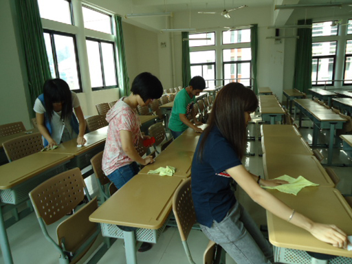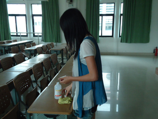 活动现场同学们秉承着服务同学、 爱护校园的宗旨积极参与活动。现场氛围浓厚,同学们都认真地做着自己手上的工作。在整个活动过程中,志愿者们的脸上始终都带着一丝不苟的认真神色,他们用手中的清洁工具,仔仔细细地擦拭着每一张课桌,认真严谨的工作着。除了做好各自的手头工作之外,一些志愿者们还会互相帮助,相互合作。他们时而发现有的志愿者有些疏漏,提醒他们要更加仔细。这样彼此之间相互监督,大大提高了整个活动的工作质量和工作效率。在这次的活动中,充分体现了大家对校园、教室等公共财产的爱护,以及其中所表现出的团队意识和协作意识。通过这次活动,同学们能够更好的爱护公物,珍惜志愿者们的劳动成果。