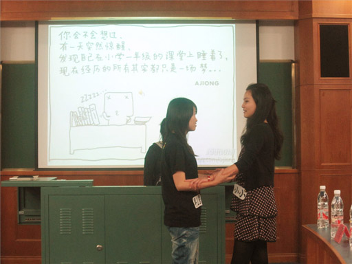 英语系林雅文同学所在的小组又以《青春的梦》为主题,作了本次团课结业式的汇报演出。演出以诙谐、幽默、生动的语言和表演形式淋漓尽致的展现了成长道路上的艰难、欢乐与痛苦并诠释了成长的真谛。通过此次汇报演出,现场气氛达到高潮。
