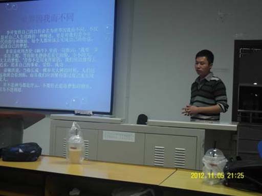 2012年11月5号,英语系12(3)班与12(4)班共同召开了主题为“我的青春我做主”的主题班会。一同参加的有3、4班的同学和辅导员陈毅超老师。在这个欢笑不断又富有意义的夜晚,两个班齐聚一堂,分享大家对于青春、梦想的态度,对于大学生活的憧憬。