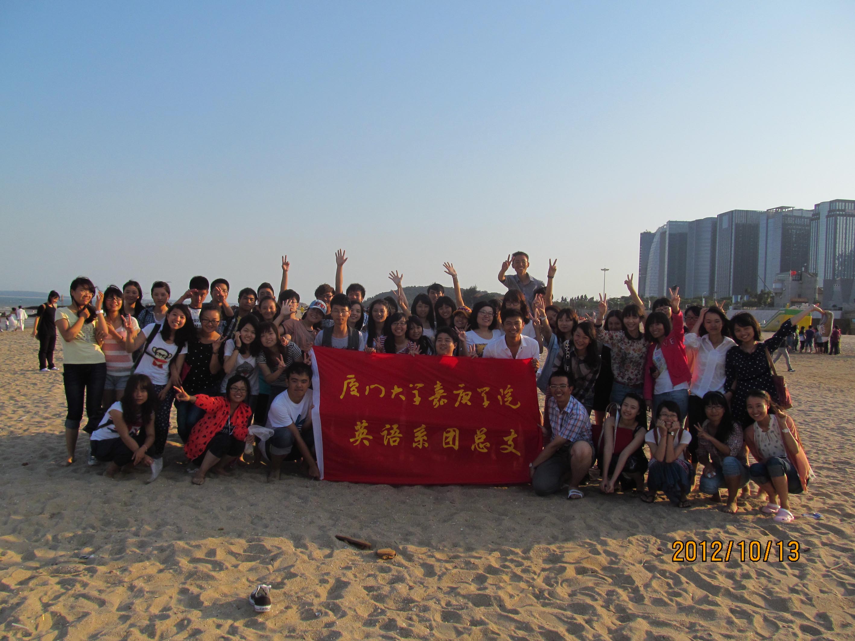 2012年10月13日,英语系团总支组织新干事出游团训。经过了2个小时的车程,整个大部队到达了厦门观音山海边开始团训。