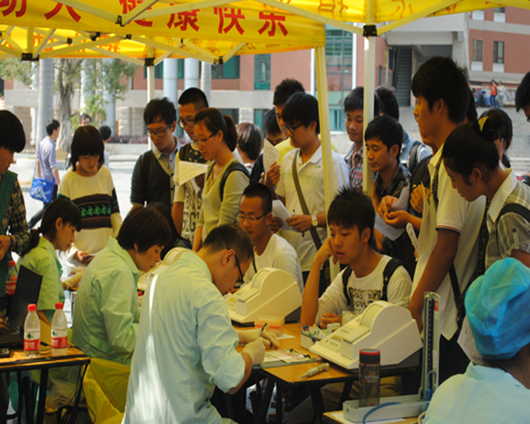 在献血活动中,医生为献血活动作现场指导。英语系学生党支部与英语系团总支的成员们维持现场秩序,并积极配合血站工作人员进行工作。献血于上午10点正式开始,填表、体检、化验、等候、抽血、休息、领献血证以及纪念品,所有流程井然有序地进行着。中午高峰期人潮涌动,天气闷热,献血队伍排的很长,然而献血者们都在等候区面带微笑地耐心等候着。在现场采访中,新生曾华成表示第一次献血的激动与欣喜之情,同时也表达了每年都想参与献血的意愿。新生刘馨说:“能够将自己额外的血液给需要帮助的人,是自己的荣幸,同时献血也能够促进血液循环。”当部分同学因为疫苗或服药或其他身体原因没能符合献血要求时,都一再询问并表示十分遗憾。甚至有一些晕血的同学都前来献血,虽然医生没有让他们献血,但他们的奉献与爱心着实令人感动。
