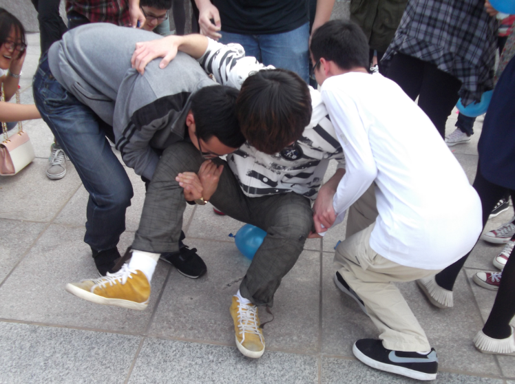 18支参赛的队伍从第一轮开始就积极踊跃,全身心投入比赛中。有些选手即使在比赛过程中摔倒,也马上起身继续进行比赛。经过第一、二轮的“托运投篮”“背靠背夹气球跑”“集体跳大绳”以及“纸杯传水”“合力吹气球”的比拼后,最后剩5支队伍进入最后一轮的比拼。