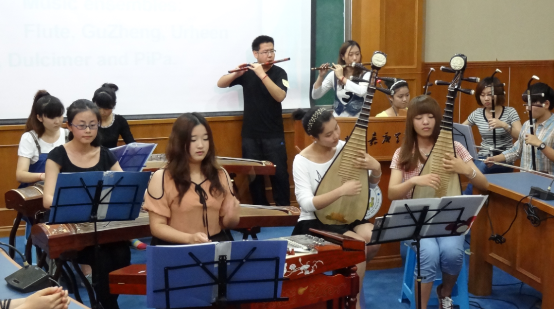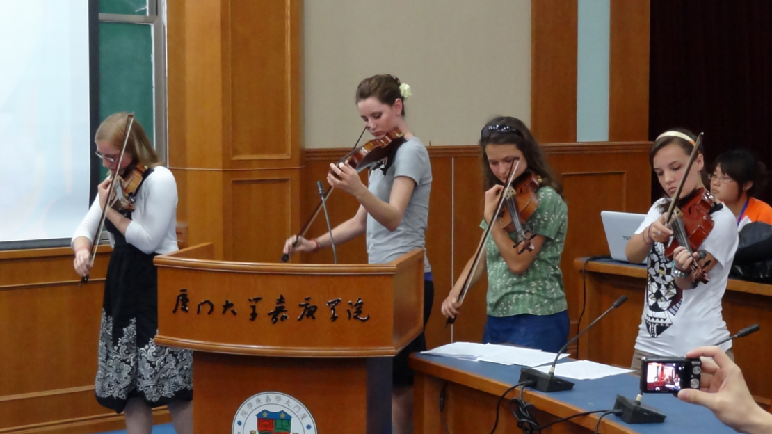 在交流会中场,万象城官网音乐学院的同学为大家带来了古典器乐的演奏,同学们都畅游在中国古典文化的海洋中。而美国的同学们则用小提琴演奏《美女与野兽》、《我心永恒》等名曲征服了大家的耳朵。