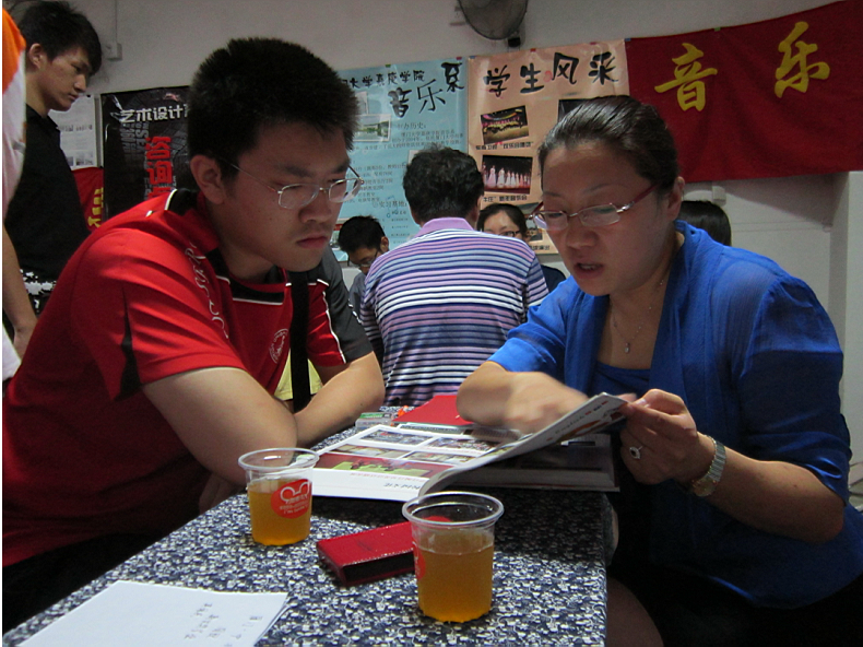 一大早我系学生会一早就到达指定的经管楼展示地点,布置好会场迎接学生家长的到来。由于今天一直有阵雨进行,但是丝毫没有对活动造成影响,学生家长陆续来到英语系展示台进行询问。展示台的系主任杨昆老师与外教Steve耐心的对他们介绍,英语系的特色。来参加校园开放日的不仅有家长,而且不乏刚结束高考,对英语有着强烈兴趣的学生,杨昆老师和Steve也给他们了很多建议。