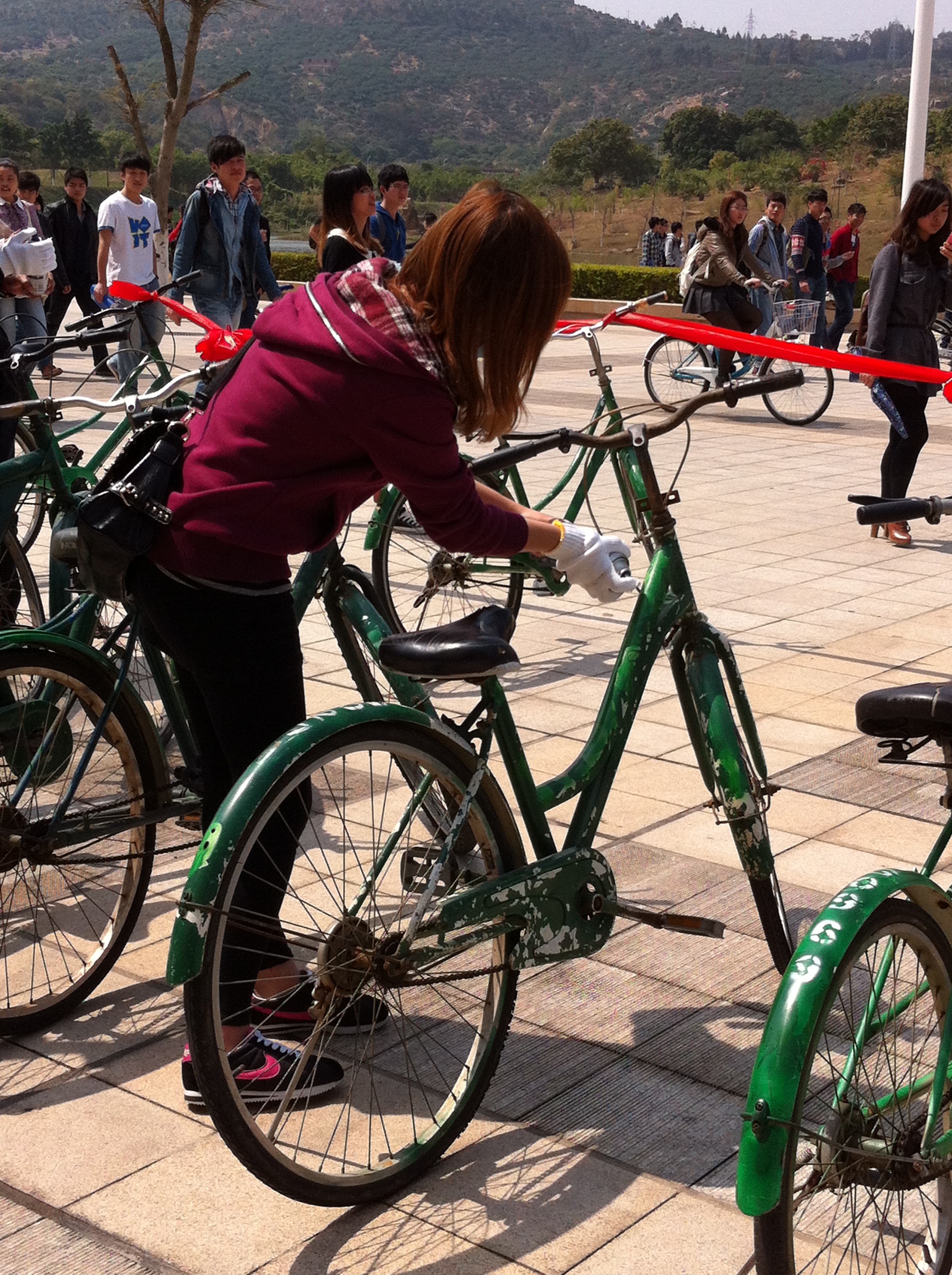 春日的阳光正好,不热也不焦躁,就像参与活动的同学们一样,耐心的追求着完美。有经验的学长学姐们指导大家喷漆时不要太靠近小绿,还要注意风向,原来为小绿“美容”也是一项技术活。参与该活动的一名英语系团总支的干事陈嘉新说“喷漆也是件挺有成就感的事”。