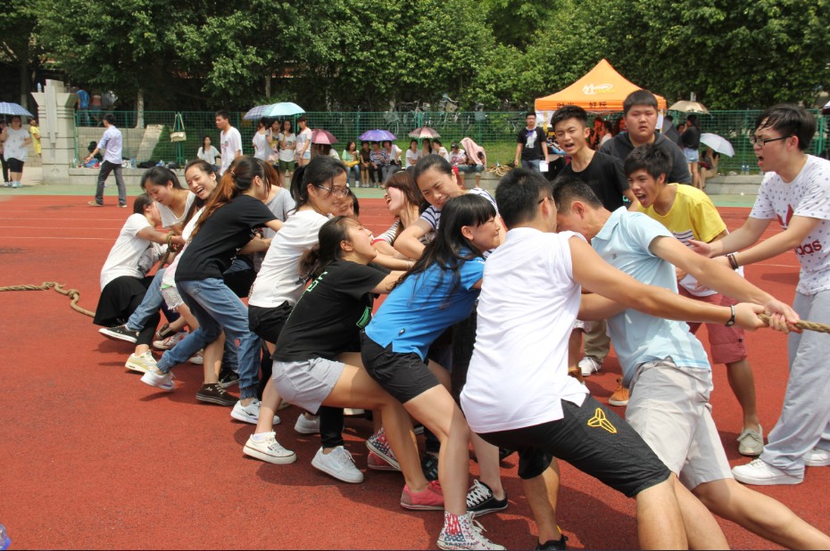 此次体育嘉年华活动包括跳长绳、两人三足绑腿跑、接力跑和拔河,共四项比赛。比赛开始,首先出场的是英语系11级3班,挥绳的同学不敢有丝毫懈怠,跳绳的同学更是全神贯注,努力地跃过绳子。而坐在旁边等待上场的同学,个个摩拳擦掌、跃跃欲试。接下来的两人三足比赛让人感叹不已,参赛的同学们互相搀扶着,或快或慢,抵达终点时,脸上无一不洋溢着灿烂的笑容。而最吸引大家眼球的拔河比赛,悬念迭起。一群看似柔弱的女生却能战胜一路过关斩将闯进半决赛的对手,势均力敌的双方却在最后的几秒内扭转了局面。