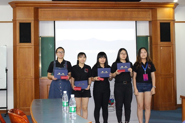 团学会副主席李丹妮、辜丹婷给各部长颁发聘书