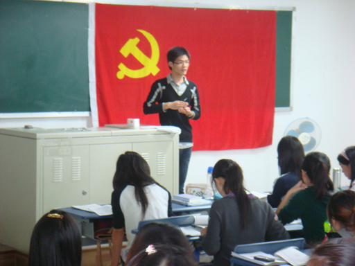 此次会议分三个流程。一是发展英语系第41期12名学生党员以及日语系2名预备党员进行的转正;二是学生党员宣誓;三是介绍英语系学生党支部策划的“涓涓热血,重铸生命辉煌”的主题活动。