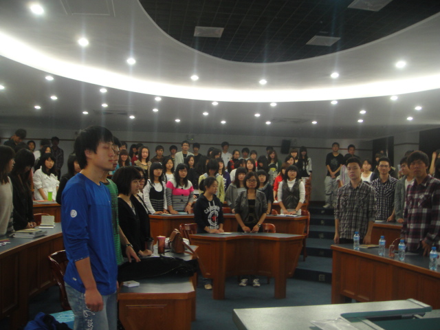 四月十一日中午十二点半,英语系和计算机系于公共教学一号楼208室共同举行了本学期第二次团课。随着庄严的团歌的响起,同学们走进了另一堂别具风格的团课。