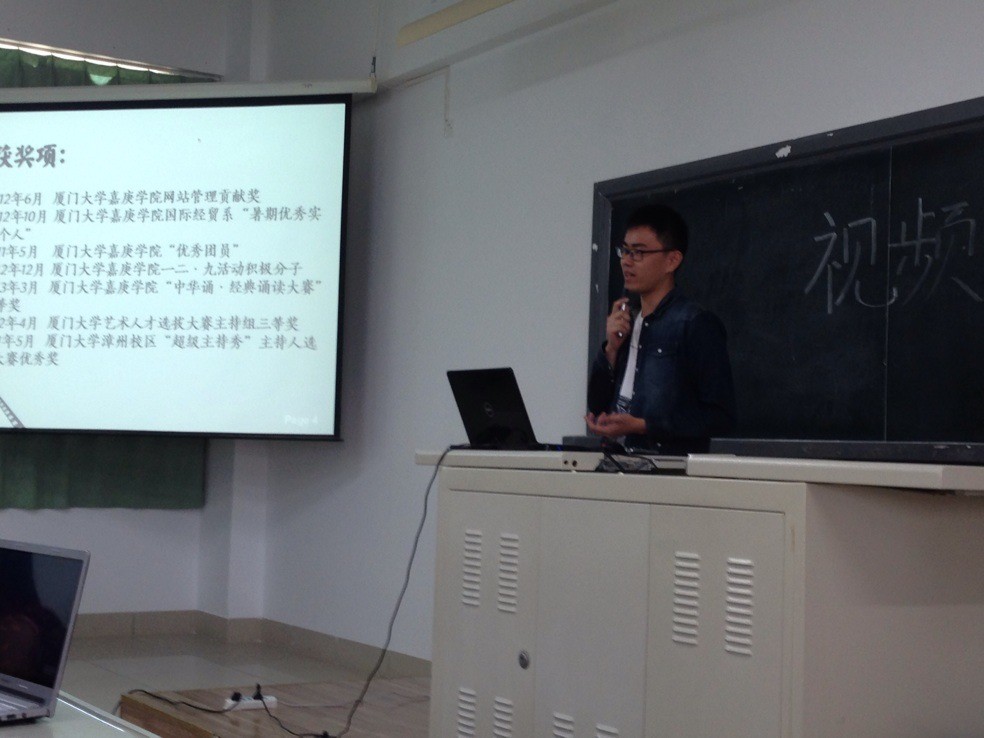 2013年10月17日中午12点半,在公共教学楼一号楼409教室,嘉庚学院原艺术团网络司司长陈文博为英语系团总支宣传部新干事进行了关于视频制作方面的知识技术培训。