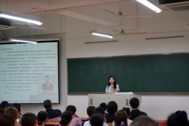 恳谈会开始,王淑娥老师首先表达了英语系对各位新生家长的欢迎。王淑娥老师说:“来到嘉庚,来到英语系,各位家长大可放心。在嘉庚的大学四年里能收获什么,需要付出什么,未来步入社会能做什么,同学们都将在英语系找到答案。”随后,王淑娥老师分别介绍了校内系内课程设置、校内软硬件设施、系内师资力量、第二外语、实践实习及转专业等问题。