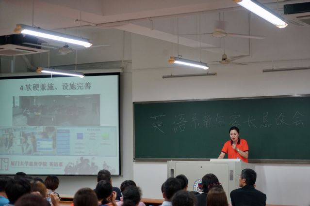 辅导员陈毓榕老师在随后的发言中以“报考嘉庚是明智的选择”为主题,为在座新生家长解读了为什么要学好英语,英语专业的优势等,并用PPT展示了近年来英语系的教研活动成果,以清晰的图表数据展示了英语系整体就业情况,近几年的考研出国情况。发言最后,陈毓榕老师表达了对新生家长的期许,希望能一同助力新生学习成长,在四年大学生活后成为自己想成为的人。