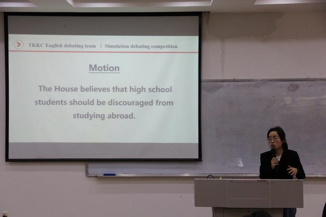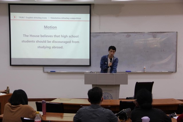 比赛在正方首相(简称一辩)曹芯睿选手的陈词中吹响了号角,她清晰地用英文将目标群体分类,并定义了出国留学的范围和概念,重点透析了该群体出国留学的行为的趋势与存在的弊端,而这一释义马上遭到了反对党领袖(即反方一辩)徐婷娟的当庭反驳。在她铿锵有力的论述中,她定位了高中生的生理和心理发展水平与成人的无限接近性,并把结合人的发展观与文化的多样性相结合,反复强调高中生出国留学和思想格局的必要性。两方一辩的开门见山也为各自阵营中其他辩手的“增援”提供了良好的开端与暖场,这场针尖对麦芒随即进入拉锯战。