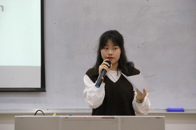 比赛开始前,陆红艳老师首先对包括观众在内的40余名师生的到来表示欢迎,随后参赛选手在辩题公布之前统一上交了通讯设备,由主持人吴凡宣布辩题并解题。所有辩手只有15分钟的准备时间,比赛全程由现场志愿者掐表按铃,每名辩手上台不超过7分钟进行陈词。准备期间,两方的辩手们在赛会准备的白纸上时而奋笔疾书,时而与同一阵营的战友出谋划策,最大限度地依赖事实,将有利于本方观点的“进攻论据”准备到无坚不摧,也将自家可能会受到对方观点冲击的“反驳防线”布置得无懈可击。