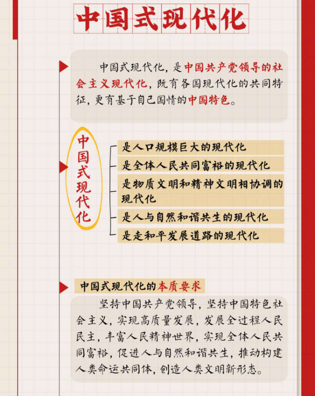 “中国式现代化”是二十大报告中的新提法,并具有深刻的内涵。具体而言,中国的人口大于北美、西欧、日本、澳洲等这些现代化国家之和,因此只要中国实现了现代化,那就是“人口规模巨大的现代化”,也是前所未有的大规模现代化。中国所追求的现代化不是那种外面光鲜亮丽、实则贫富差距悬殊的虚假的现代化,而是要实现全体人民共同富裕的现代化,因此我们过去十年致力于脱贫攻坚,现在和未来我们把农业农村放在优先发展的地位,从而让发展的成果惠及全体人民。上述所说的已经实现现代化的国家,比如美国,存在着严重的精神空虚的社会问题,一个典型的表象就是吸毒和药物滥用非常严重。我们所要的现代化不是物质文明搞上去了,精神文明却在低位,而是两者互相协调的。中国式现代化,非常重视生态文明,过去十年,中国的生态改善非常明显,世界上森林增加的面积也主要来自于中国,中国的天更蓝了,水更绿了,说明我们所追求的是人与自然和谐共生的现代化。最后,西方的现代化道路是充满原罪的,他们通过殖民扩张和掠夺的方式实现了带血的现代化,而我们中国改革开放四十多年以来,一直是通过自己的勤劳和智慧,一步一个脚印实现的,真正实现了和平崛起,所以我们的现代化是走和平发展道路的。