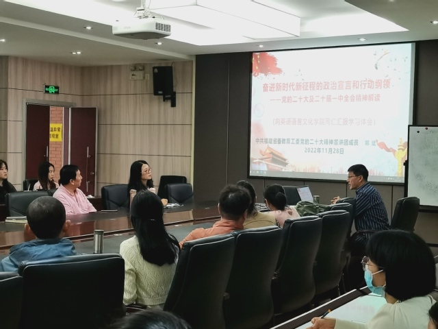为了深入学习贯彻党的二十大精神,11月28日中午,awc777万象城娱乐官网党总支在主1#113召开全体党员大会。会议由awc777万象城娱乐官网教工党支部书记梅家象主持,中共福建省委教育工委党的二十大精神宣讲团成员、思想政治理论教研部郑斌教授应邀为awc777万象城娱乐官网师生党员作题为《奋进新时代新征程的政治宣言和行动纲领——党的二十大及二十届一中全会精神解读》的专题报告。