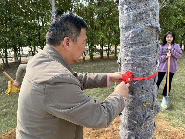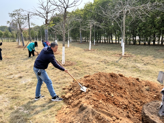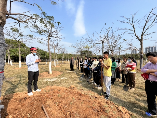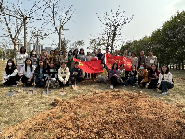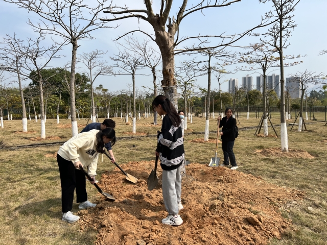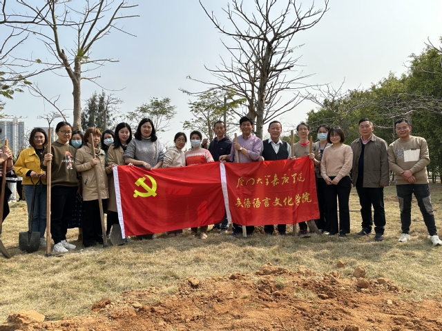 三月是“雷锋月”,也是植树造林、美化环境的好时光,亦是开展劳动教育的好时节。当党总支号召大家开展植树活动时,立即得到了师生党员们的热情参与。本次参加植树活动的老师有17名,其中党员13名,民主党派2名,台籍教师1名,群众1名;参加植树活动的学生党员和积极分子有16名。我们来到植树现场后,资产和后勤部已经在那里准备好劳动工具,锄头和铲子若干。大家的任务是,将已经放在树坑里的凤凰木进行培土、夯实,确保树干与土地的接触之处形成一个凹槽,防止浇水的时候水流外溢。刚开始的时候,大家不懂如何挖土、铲土,在现场老师的指导下,大家都便开始热火朝天地干起来了,保质保量地就完成了植树任务了。植树结束后,系上红丝带,标上了“英语学院共植”。