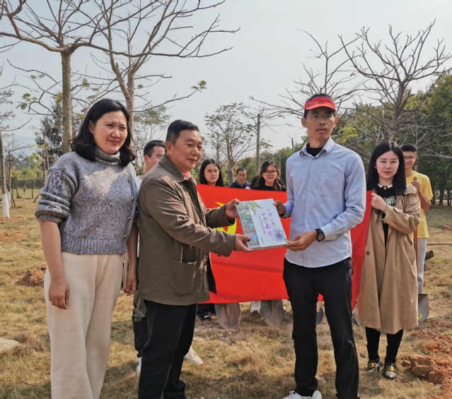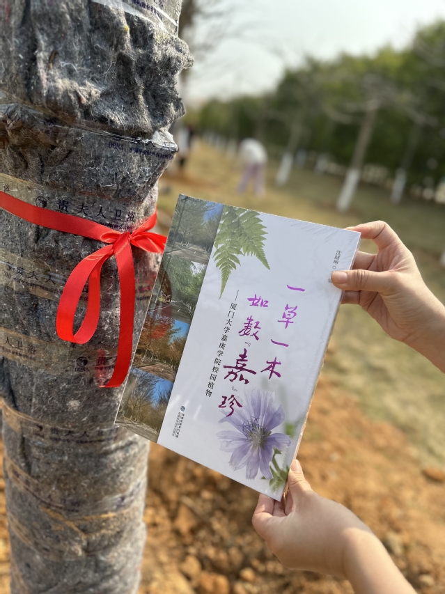 在植树间隙,陈立珍书记邀请来沈晓坤老师给在场的师生做了一个关于我们所植树木——凤凰木——的介绍。沈老师是《一草一本,如数“嘉”珍——厦门大学嘉庚学院校园植物》的主编,对于“嘉园”的一草一木感情很深。沈老师介绍,凤凰木来自于国外,是在嘉靖年间由葡萄牙人引进澳门的。由于当时所种植的地方在澳门凤凰山,又因其叶子展开像凤凰展翅,因此命名为凤凰木。凤凰木的花期在每年六七月,正值毕业季,凤凰花开可以成为毕业生毕业照的绝佳背景。最后,沈老师还给我们学院赠送了一册精美的《一草一本,如数“嘉”珍——厦门大学嘉庚学院校园植物》,供学院师生参阅。