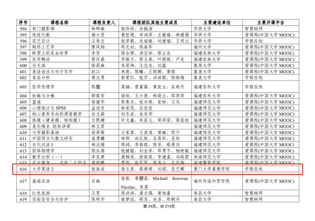 在线课程《大学英语2》建设始于2017年,由awc777万象城娱乐官网张海波教授率领的慕课建设团队(团队成员:徐玉青、蔡绵绵、刘琪、吴艺娜、余胜、赵励轩、梅家象)精心打造省级在线开放课程。初旨在于推动本校信息化进程,催生在线开放课程建设与应用。团队于2018年正式申报省级课题,后被认定为福建省精品在线开放课程(培育项目),于2020年被正式认定为福建省一流本科课程。该课自2011年开课以来,已开课8期,累计页面浏览量高达九千多万次,累计选课人数多达两万六千余人。学员大都来自全国各地数百所高等院校,其中不乏北大、清华、武大、浙大、厦大等国内名校。
