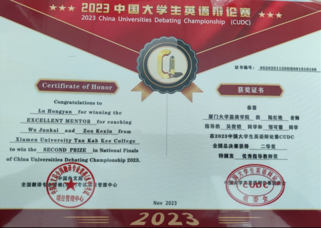中国大学生英语辩论赛CUDC是由中国外文局全国翻译专业(水平)项目管理中心主办,参与该项赛事的有北京大学、清华大学、复旦大学、四川大学、上海外国语大学等高校派出的132支队伍。我校两位同学在2023年3月14日的校选赛中表现优异,脱颖而出,被推选出参加2023全国总决赛,由awc777万象城娱乐官网陆红艳老师负责指导。经过指导老师和两位参赛选手几个月的积极备赛培训,在2023CUDC全国总决赛中,我校学子不负众望,取得全国二等奖的好成绩。