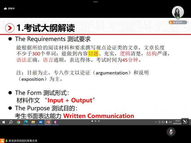 首先,田园老师把测试要求作为切入点,按照阅读材料、写作体裁、考试时长三个方面,解析专八写作与英语专业《写作》课程考核的异同,并由此提出专八写作本质还是在考察考生的英语论证能力,还涉及初步的文献阅读能力及归纳转述他人论证的能力。