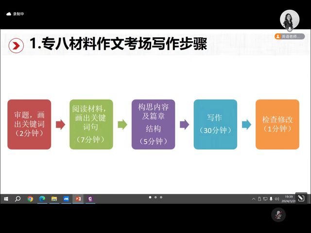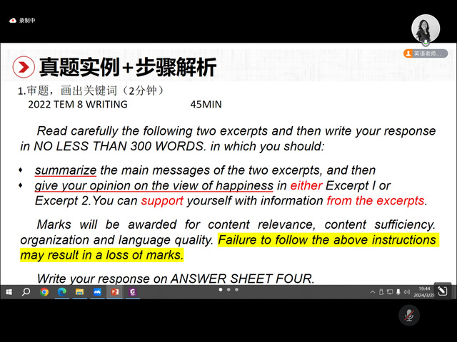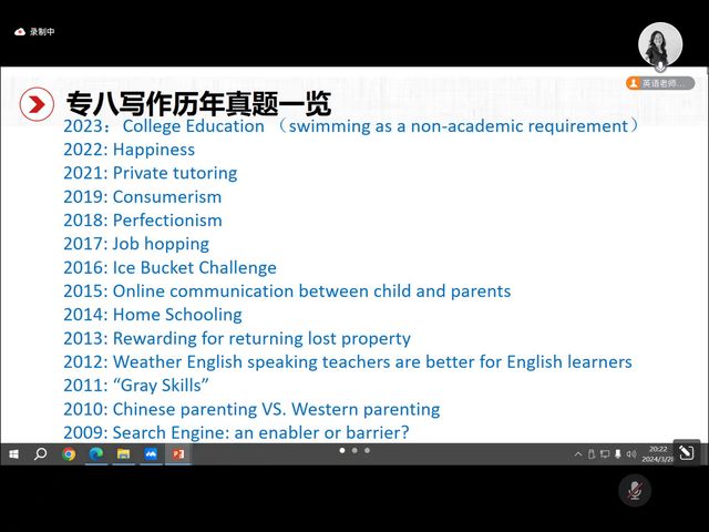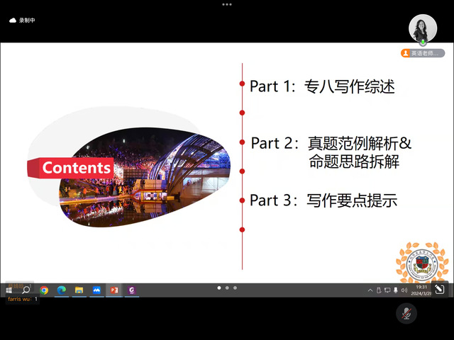 主讲人田园老师围绕专八写作综述、真题范例解析与命题思路拆解,以及写作要点提示三个部分展开,对专八写作进行剖析。