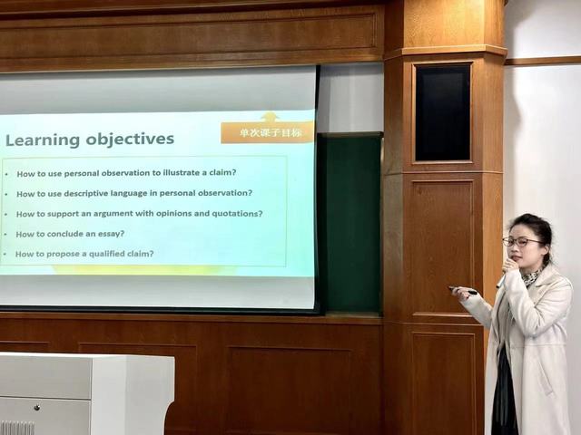 接着,蔡雅瑜老师以说播课的方式再现了厦门大学第18届教学比赛现场的授课,从比赛介绍、教学设计、教学过程和比赛反思四个角度展开。5次课的教学设计有效践行“产出导向法”,从设计恰当的产出目标出发,遵循“输出驱动-输入促成-产出评价”的教学流程,把大的单元总目标拆分成5个核心子目标。每次课都设置一个具体的、可操作的子目标来帮助学生降低他们的学习焦虑感;用输入材料引领学生进行选择性学习,最终实现学用对接。