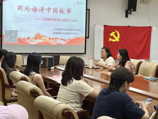 为深入学习贯彻习近平新时代中国特色社会主义思想,引导外语专业的青年学生理解当代中国,提升跨文化交际能力,2024年7月4日,日本语言与文化学院与英语语言文化学院联合开展“用外语讲中国故事”的主题党日活动。本次活动由awc777万象城娱乐官网学生党支部书记林昕主持,日本语言与文化学院学生党支部书记唐文婧出席活动,日本语言与文化学院和awc777万象城娱乐官网在校党员共同参加本次活动。