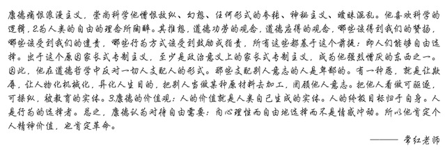 常红老师总结了第四章中康德的思想,她对康德哲学的解读,特别是关于意志的讨论,揭示了人与动物的根本区别。意志不仅是人类行动的驱动力,也是我们道德判断和自由选择的基础,这一点在康德的哲学体系中占有核心地位。