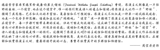 周宜丹老师则引用了德国哲学家谢林对浪漫主义的比喻,梳理文本和展示了浪漫主义的情感与意志相结合,通过诗歌的形式表达了浪漫主义对个人情感的重视。这种艺术形式不仅丰富了文学的内涵,也展现了浪漫主义对个人内心世界的深刻洞察。