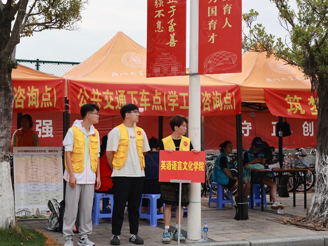 学长学姐们身着黄色志愿者马甲笑迎新生,指引方向,助力快速报到,温暖启航。